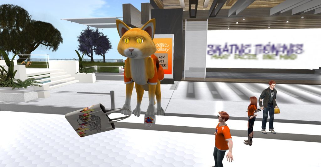 Instructors Maize Longboat, Skawennati, and Shirley Ceravolo welcomed an enthusiastic group of workshop participants from the Immersivité et innovations technologiques colloque who were interested in designing avatar representations of themselves. Participants’ virtual bodies were first teleported to AbTeC Island, our cyberspace headquarters located in Second Life, and were then shown the basics of how to use the platform. This included how to move around the space and use the camera, how to edit their avatar’s appearance, and how to shop for new bodies, hair, clothing and accessories using the online Second Life Marketplace. Everyone was provided a modest budget of Linden Dollars, Second Life’s virtual currency, to customize themselves to their liking. Many participants returned a couple nights later for a guided tour of AbTeC Island and a live in-world performance by the Montreal-based multidisciplinary artist and AbTeC RA Swarm.