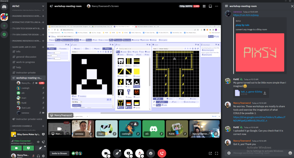 The third day consisted of the Bitsy portion of the workshop. With only one session to learn how to use Bitsy, the participants caught on quickly and made games about salmon talking to fish, cat potions, and murder mystery.