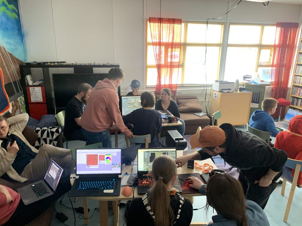 After two long days of travel, we arrived in the village of Utsjoki in Sápmi where we met with Outi Laiti to organize/host a Sámi Game Jam for a group of youth! Sápmi is the traditional territory of the Sámi peoples, and is also called Lapland, which is the largest and most northern region of Finland. The Sámi live across Finland, Sweden, Norway and Russia. Taking a rest day when we arrived, the team took a necessary break in the sauna. We also experienced midnight sun, where the sun does not set as midsummer is just around the corner.