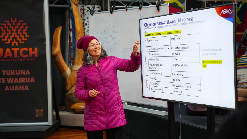 Per Skins protocol, we exchanged ceremonies. Our hosts spoke the Māori karakia and had a small feast prepared in our honor after we shared breath. Skawennati recited and had the matchies repeat the Haudenosaunee Ohèn:ton Karihwatéhkwen (“Thanksgiving Address” or “Words Before All Else”), reminding us all to work together and be grateful for our world. Then we all got to work!